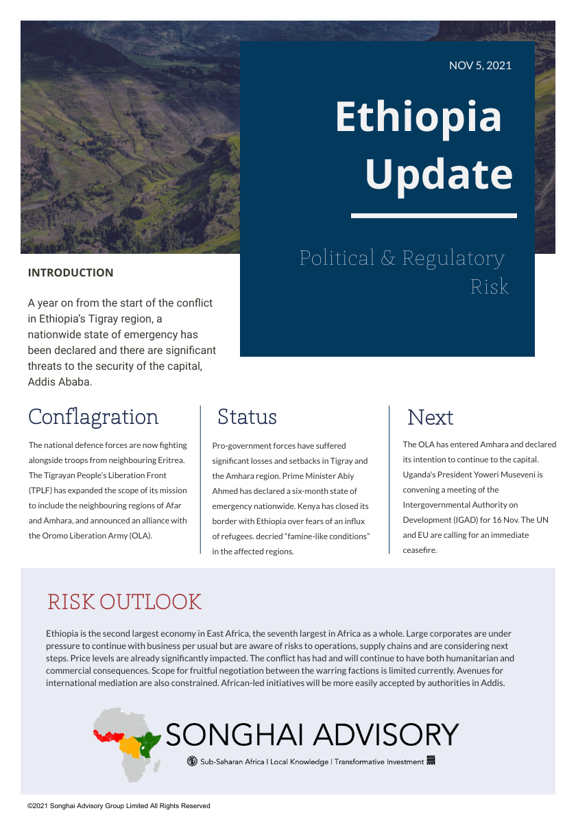 A year on from the start of the conflict in Ethiopia’s Tigray region, a nationwide state of emergency has been declared and there are significant threats to the security of the capital, Addis Ababa. Large corporates are under pressure to continue with business per usual but are deeply aware of risks to operations, supply chains and are considering next steps. Price levels are already significantly impacted. The conflict has had and will continue to have both humanitarian and commercial consequences. Please get in touch below to request the full report.
