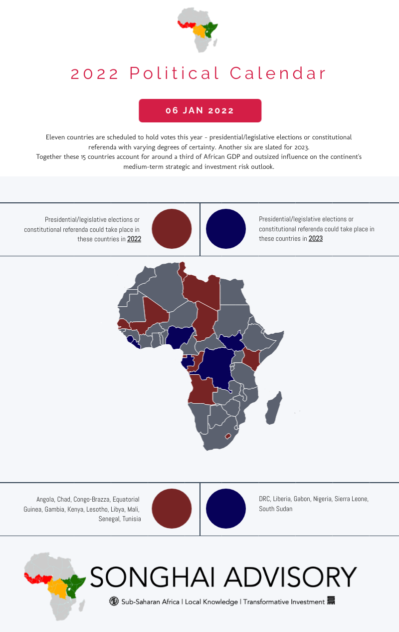 Presidential elections, legislative elections and a constitutional referendum are scheduled to take place across the region over the next twelve months. The year will also be shaped by preparations for 2023 elections in Africa’s two largest nations by population/GDP and landmass - Nigeria and the DRC.