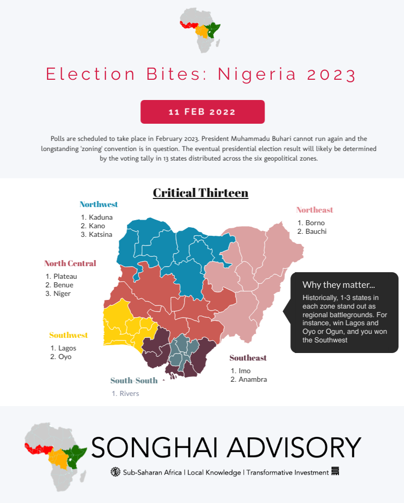 Polls are scheduled to take place in February 2023. President Muhammadu Buhari cannot run again and the longstanding 'zoning' convention is in question. Whoever the All Progressives Congress (APC) and the opposition People’s Democratic Party (PDP) choose as candidates, the eventual result will likely be determined by the voting tally in 12 states distributed across the six geopolitical zones.