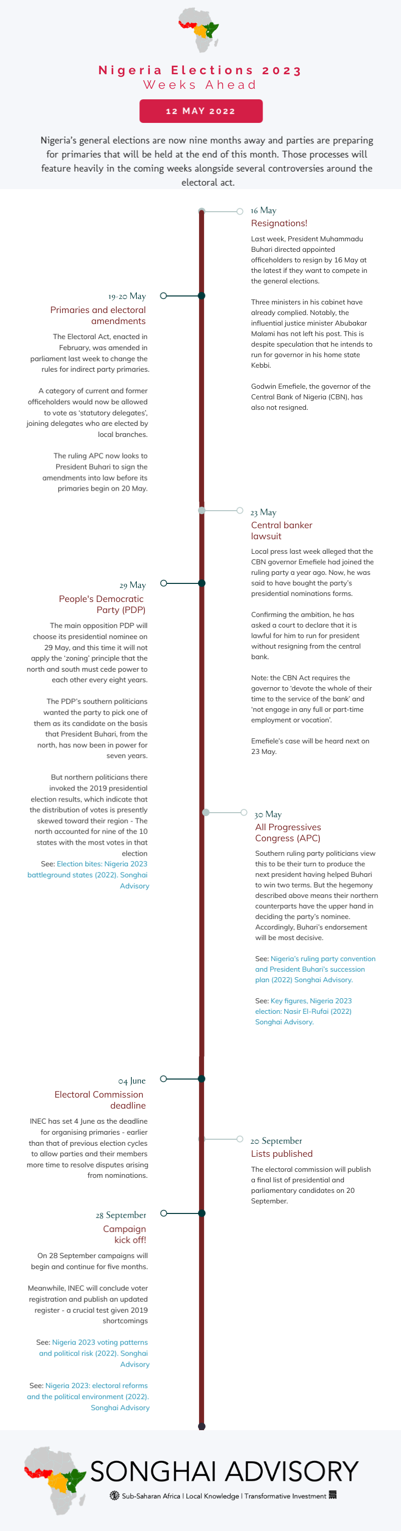 Last week was made eventful by former president Goodluck Jonathan’s purported defection to the ruling All Progressives Congress (APC) and Central Bank governor Godwin Emefiele’s lawsuit (Emefiele wants to run for president without resigning from the central bank). We can expect more such headlines as the below timeline unfolds.